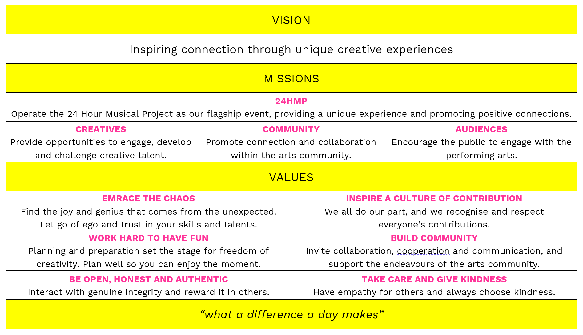establishing and operating the 24 Hour Musical Project and other public performance ventures to advance culture and positive engagement in the performing arts,
