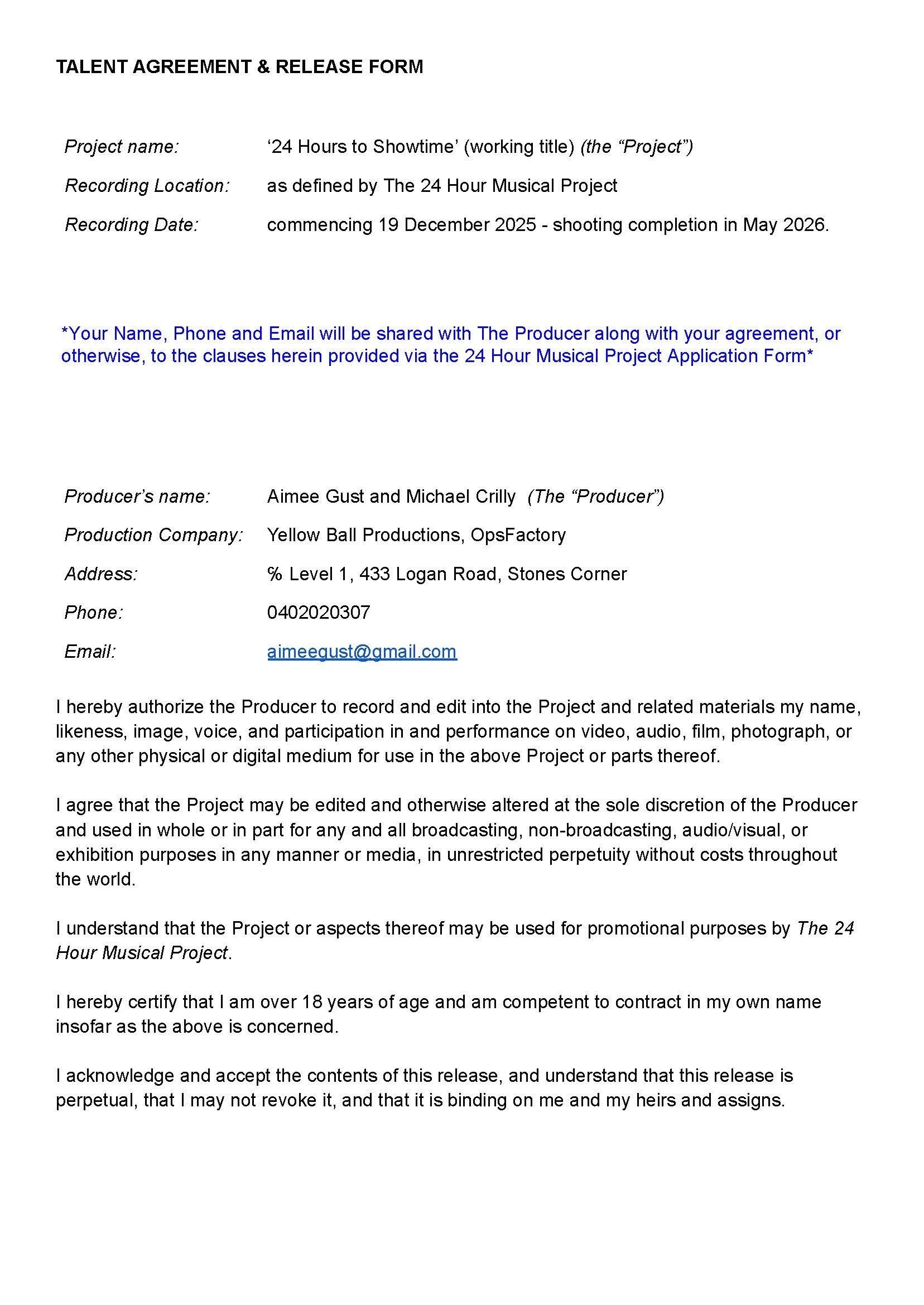 While the 24HMP Foundation is obviously assisting with access and capture of footage, and very excited to be the subject of the film, we are not the Producers of the documentary. Therefore, participants in this year’s Project are required to review the Talent Release below and provide consent (or otherwise) to the Documentary Producers, in addition to the media consent provided to 24HMP.